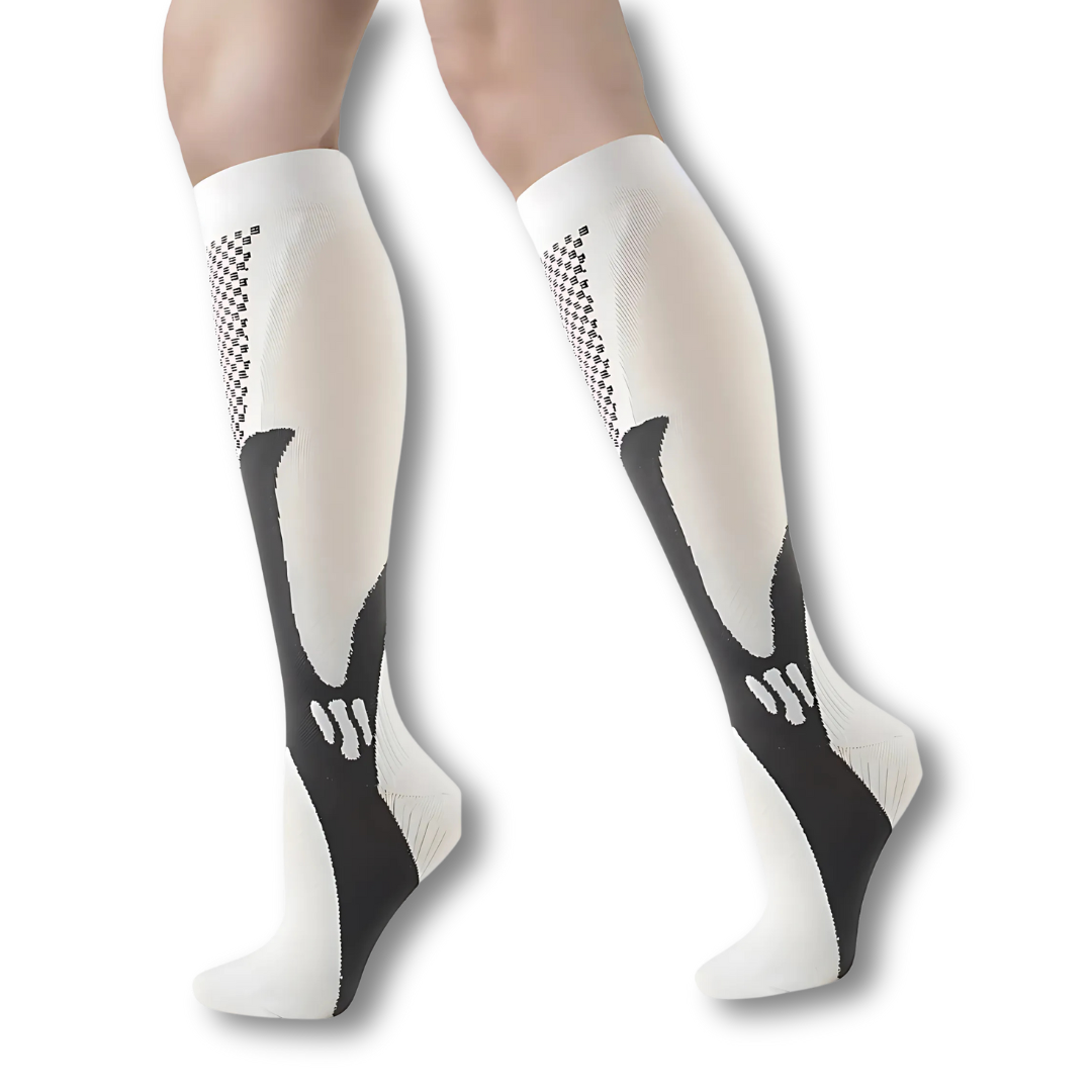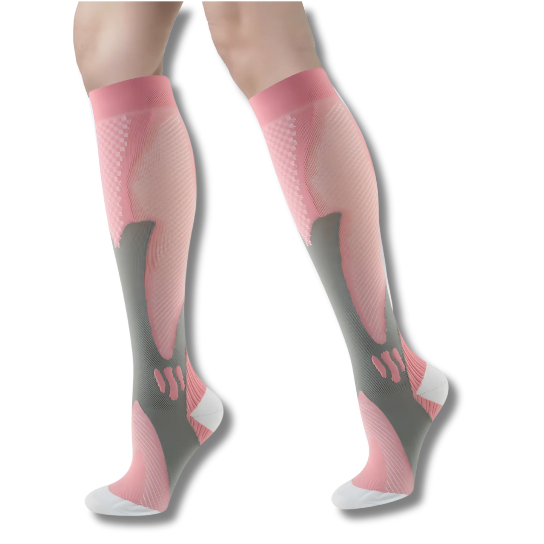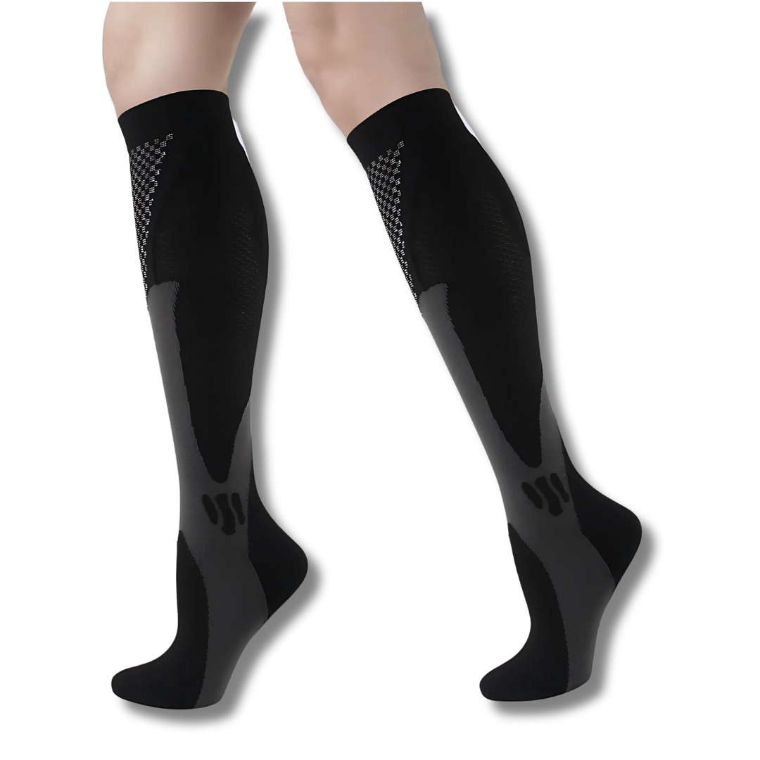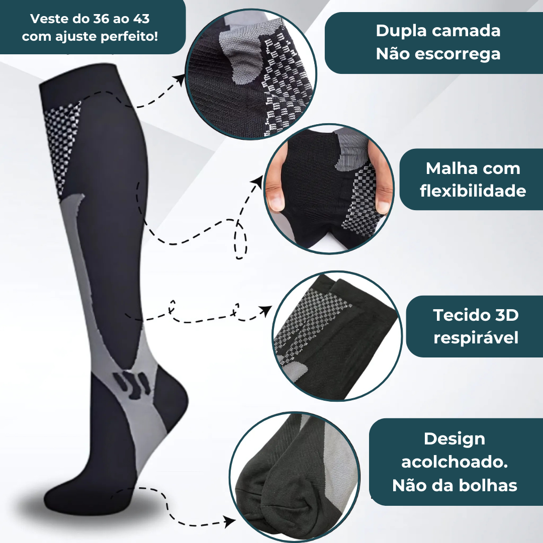 A compressão graduada estimula o retorno venoso, evitando o acúmulo de sangue e o surgimento de varizes — ideal para quem fica muito tempo em pé, sentado ou em movimento.