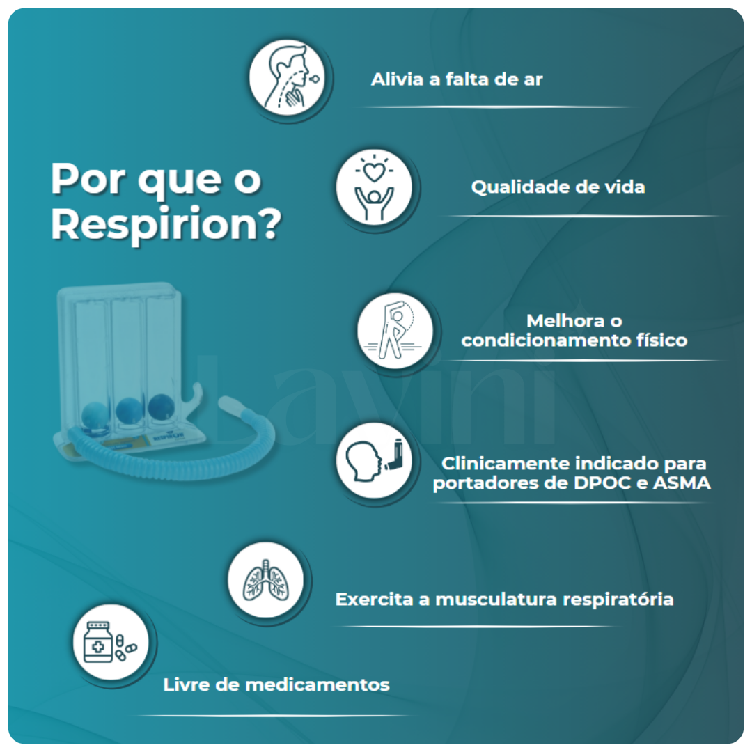 O RESPIRON Classic é indicado para iniciação do exercício respiratório de indivíduos sedentários que buscam qualidade de vida e melhora do desempenho físico, clinicamente indicado para portadores de DPOC, ASMA e insuficiência cardíaca.